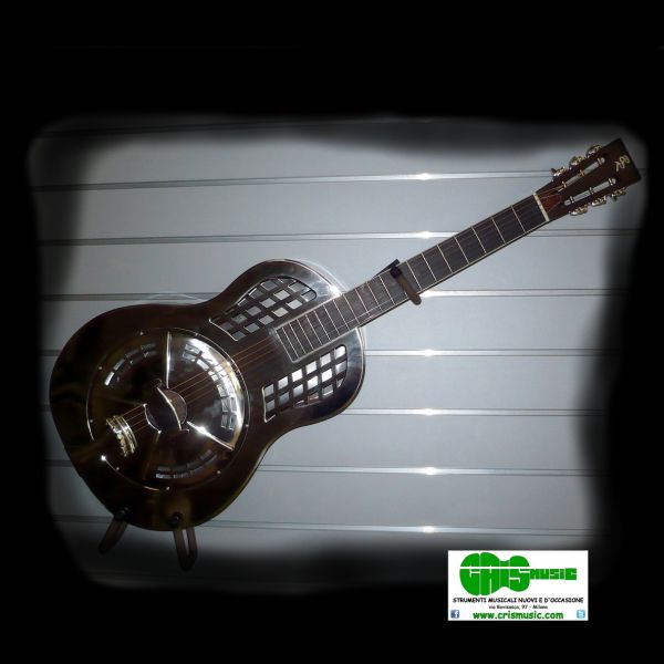 Chitarra resofonica singolo risuonatore, corpo in ottone con finitura nickel spazzolato, manico in sapele, tastiera in pino BlackwoodTek 19 tasti, attacco al corpo al 12? tasto, ponte biscuit. Custodia rigida foam compresa.
